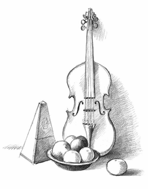 На первом этапе мы сделаем набросок основных элементов музыкального натюрморта. Постарайтесь не уделять много времени деталям, просто обозначьте главные формы и композицию.