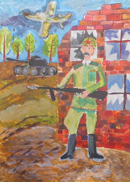 Этот трогательный рисунок, созданный Ириной, 7 лет, показывает, что герои живут в наших сердцах. Ирина изобразила солдат, которые стали настоящими героями для ее семьи и страны. Этот рисунок напоминает нам о важности помнить и уважать тех, кто сражался за нашу родину.