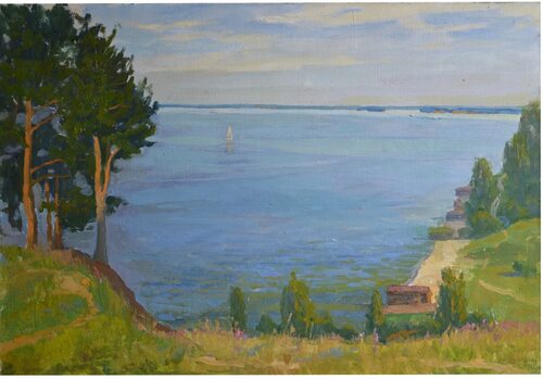 Попробуйте изобразить красивый пейзаж Волги. Вы можете нарисовать ее широкие воды, окруженные зелеными лесами или песчаными пляжами. Используйте разные оттенки синего и зеленого, чтобы передать глубину и красоту реки.