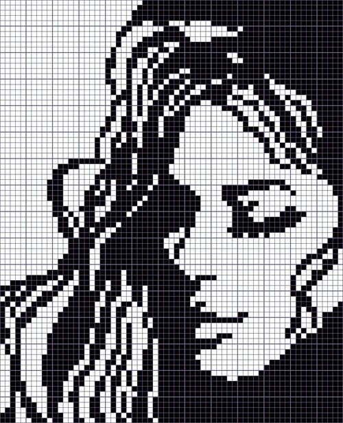 Затем, используя черный маркер, аккуратно проведите контуры лица, волос и других деталей рисунка. Постепенно заполните все черные области, следуя клеточной сетке на бумаге.