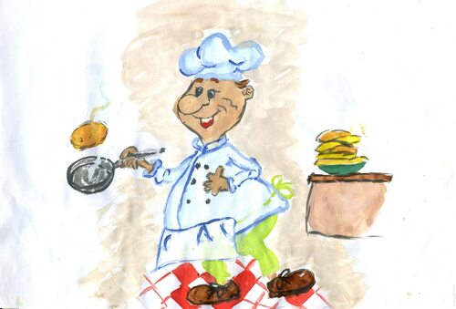 Теперь настало время придать жизнь вашему рисунку! Если вы решили использовать акварель, аккуратно нанесите краски на свои контуры. Выберите яркие и сочные цвета, чтобы передать всю радость и вкусность блюд повара.