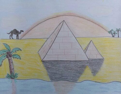 Пирамиды - это исторические сооружения, которые ассоциируются с Египтом. Нарисуйте пирамиду в виде треугольника с большим основанием и маленькой вершиной. Добавьте детали, такие как блоки камней или фараонские гробницы на боковых сторонах. Используйте светлые пастельные тона, чтобы создать ощущение теплоты и песчаных дюн.
