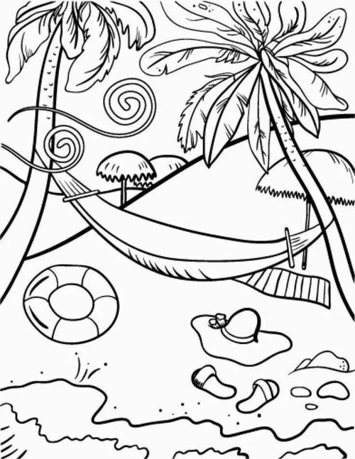 Нарисуйте пляжный пейзаж с пальмами, зонтиками и морем, и предложите ребенку раскрасить его. Малышам можно предложить раскрасить песок и море в разные оттенки синего и желтого, а старшим детям можно дать возможность добавить детали на свое усмотрение.