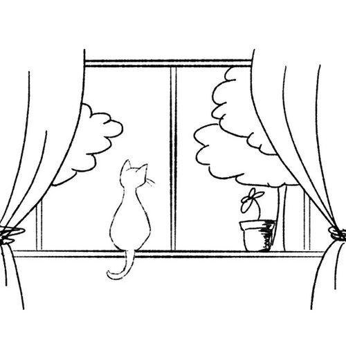 Ниже представлена раскраска с готовым рисунком кошки на окошке. Распечатайте ее и предложите ребенку раскрасить, используя разные цвета и фантазию. Фотографии готовых работ также доступны для вдохновения.