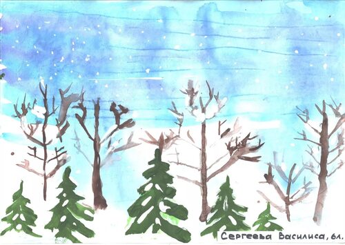 Один из рисунков представляет зимний лес с ярко-синим небом и снежными елками. Ребенок использовал краски, чтобы передать красоту зимнего пейзажа и добавил небольшие детали, такие как олени и снежинки, чтобы создать атмосферу сказки.