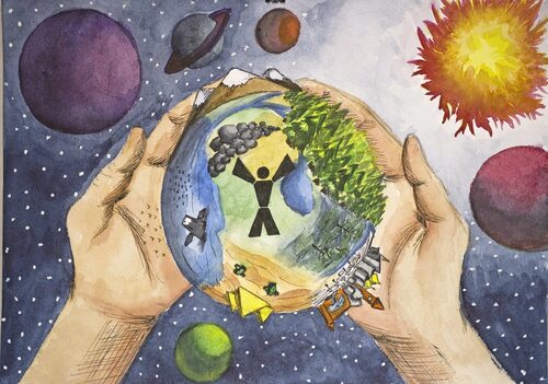 3. Фото рисунка, изображающего человека, который сажает дерево, чтобы подчеркнуть важность посадки новых растений для сохранения экологического баланса.