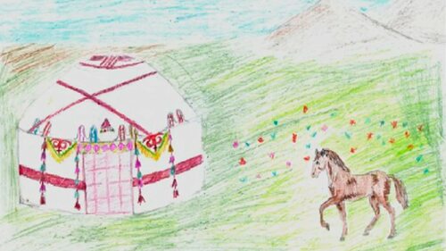 На детских рисунках мы видим юрту, окруженную просторами степи. Яркие цвета, разнообразные оттенки и многочисленные детали делают эти рисунки настоящими произведениями искусства. Дети отображают в них жизнь в юрте и ее окружающую среду - степь, солнце, небо, деревья и цветы. Иногда они добавляют на рисунки кочевников, которые живут в юрте и занимаются своими повседневными делами.