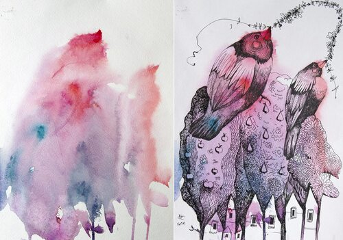 После того, как вы создали основу рисунка пятнами, можно приступить к добавлению деталей. Используйте тонкую кисть, чтобы нарисовать контуры предметов или создать интересные узоры и линии.