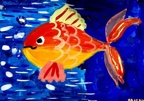 Поздравляем! Теперь у вас есть прекрасный рисунок золотой рыбки в детском стиле. Вы можете повесить его на стену, подарить кому-то или просто наслаждаться им. Не забудьте сфотографировать ваше творение и поделиться им с друзьями и родными!