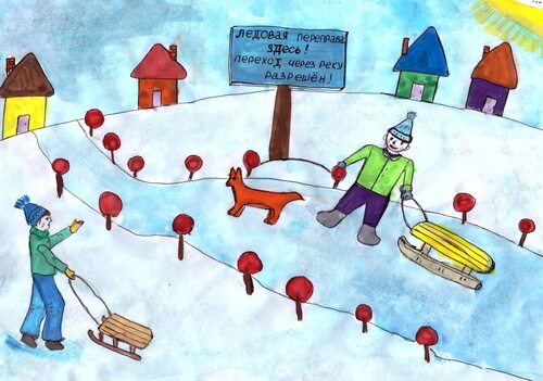 Дороги зимой могут быть скользкими и плохо видимыми из-за снега. Ребята должны знать, что играть на дороге очень опасно. На рисунке можно показать, что нужно играть только на специально оборудованных площадках и не подходить к проезжей части.
