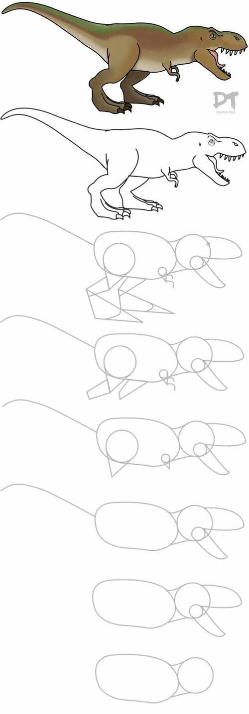 После того, как вы нарисовали все детали, прорисуйте контуры Динозавра Рекса, делая их более четкими и толстыми. Стерите линии, которые больше не нужны.