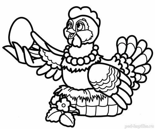 На этом рисунке курочка Ряба сидит на гнезде с яйцами. Она готовится стать мамой и высиживает своих будущих птенцов. Ты можешь придумать, какие цвета будут яйца и каких размеров они будут. Может быть, у тебя получится создать настоящий праздник весны на этой картинке!