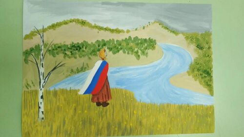 Первый рисунок показывает прекрасные просторы нашей родины. Широкие поля, горы, реки и леса - все это можно увидеть на этом ярком и живописном рисунке. Ребенок использовал разные оттенки зеленого для передачи различных оттенков ландшафта и создания объема.