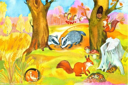 Следующий рисунок показывает веселую белочку, собирающую орехи перед наступлением зимы. Дети используют теплые цвета, чтобы передать теплоту и уют осени, а также ожидание зимнего сезона.