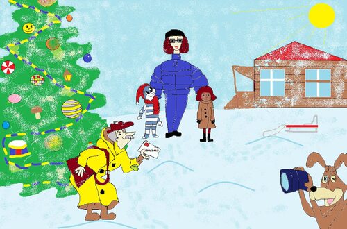 На этом рисунке ребенок изобразил зимний лес, покрытый снегом. Вокруг деревьев расположены игрушки и подарки, что символизирует приближающиеся новогодние праздники. Яркие цвета и улыбающиеся лица говорят о радости и веселье, которое дети испытывают зимой.