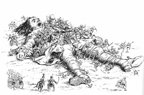Фото раскраски по мотивам рисунка Гулливера в стране лилипутов