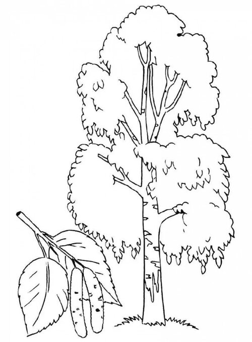 Другой вариант раскраски березки весной, где можно использовать разные оттенки зеленого для листьев и коричневого для ствола.