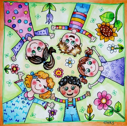 На пятом рисунке изображены дети, которые растут и развиваются вместе. Они изображены с рюкзаками на спинах, что символизирует их готовность к новым знаниям и приключениям. Они идут вперед, держась за руки, готовые поддерживать друг друга во время путешествия по пути образования и дружбы.