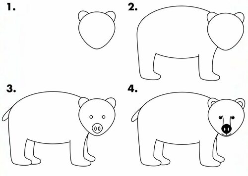 Продолжите рисовать контуры медведя, добавляя детали. Нарисуйте уши, глаза, нос и рот. Затем добавьте передние и задние лапы медведя.