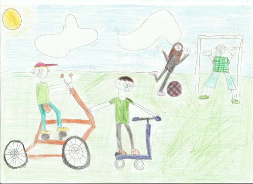 На первом рисунке я изобразила футбольное поле, на котором играет моя семья. Мы проводим много времени вместе, играя в футбол, и этот рисунок отражает наше взаимодействие и веселье на поле. Я использовала яркие краски, чтобы передать энергию и страсть, которую мы испытываем, когда играем вместе.