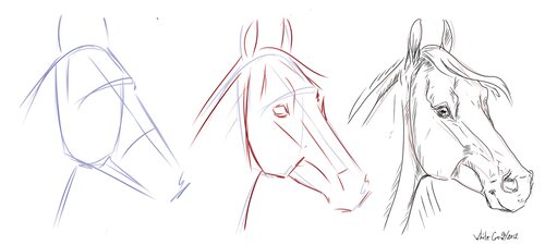 На этом этапе, добавим более детальные очертания головы. Нарисуйте глаза, нос, рот и подробности ушей. Учтите пропорции и форму лошадиной головы. Используйте фотографии в качестве примера, чтобы сделать рисунок более реалистичным.