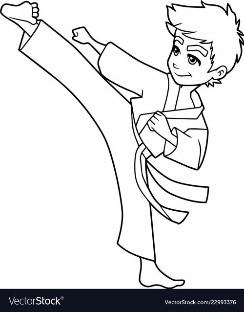 Этот рисунок показывает каратиста в движении. Он выполняет высокий удар ногой. Вы можете выбрать любые цвета для его формы и пояса, чтобы создать яркий и динамичный образ.