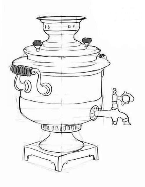 Первый шаг - нарисовать основные формы самовара. Начните с рисования большого овала внизу листа бумаги - это будет основание самовара. Затем нарисуйте прямоугольник с закругленными углами для верхней части самовара. Добавьте маленький овал на верхушке для крышки самовара.