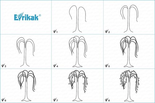 Ива - это древесное растение с характерными длинными и узкими листьями. Начертите несколько изогнутых линий, исходящих из веток. Затем добавьте мелкие детали - жилки на листьях. Помните, что ива имеет пушистые листья, поэтому добавьте некоторые курчавые линии на краях листьев.