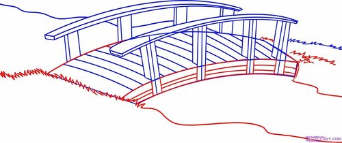 Попросите ребенка нарисовать горизонтальные линии над опорами моста, чтобы создать дорогу. Можно добавить пунктирные линии, чтобы сделать дорогу более реалистичной.