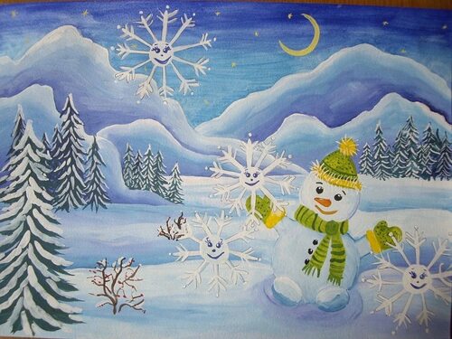 Первым нашим героем является рисунок, изображающий зимний лес. Дети использовали яркие краски, чтобы показать великолепную красоту заснеженных деревьев и пушистых снежинок, плавно летящих с неба. Взглянув на этот рисунок, можно почувствовать себя настоящим путешественником в сказочный лес.