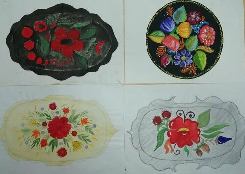 Ниже представлены фотографии примеров легких детских рисунков в стиле Жостовской росписи: