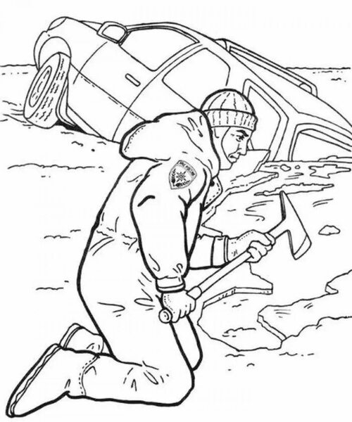 На этой раскраске изображен спасатель, который находится на лодке и помогает людям в беде. Ребенок может раскрасить воду и придумать, какие еще ситуации могут возникнуть на воде, где потребуется помощь спасателя.