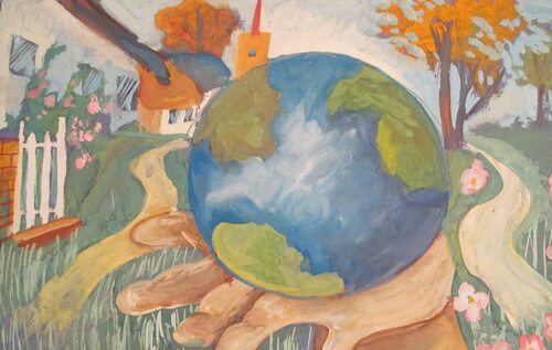 На этом рисунке изображены руки, держащие Землю. Художник хочет подчеркнуть, что каждый из нас может внести свой вклад в сохранение планеты, и мы должны держаться вместе, чтобы оберегать ее.