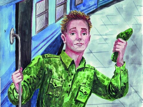 Первый рисунок, который мы предлагаем вам посмотреть, изображает детскую игру "Военные". На рисунке видно, как ребенок с радостью примеряет на себя форму и роль настоящего солдата. Его воображение создает целый мир военных операций и захватывающих приключений.
