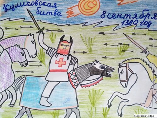 Этот рисунок символизирует память о героях Куликовской битвы. На нем можно увидеть памятник, установленный в честь погибших воинов. Маленький мальчик с цветами возле памятника напоминает о важности помнить и чтить наших предков.