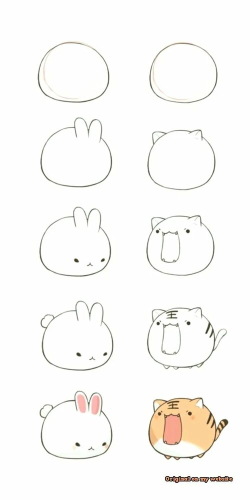 Начнем с самого простого - рисунка котенка. Для начала нарисуйте крупный овал - это будет тело котенка. Добавьте маленькие круглые ушки и небольшие овалы в качестве глаз и носа. Затем нарисуйте улыбающийся ротик и маленькие лапки. Дополните рисунок милыми полосками на теле котенка, чтобы он выглядел еще привлекательнее. Ваш рисунок котенка готов!