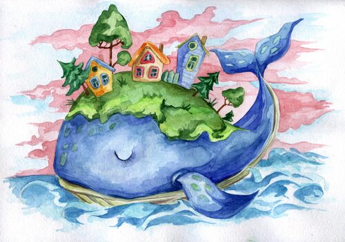 1. Начните с нарисованного океана. Нарисуйте волны и пузырьки вокруг рыбы-кита, чтобы создать эффект подводного мира.