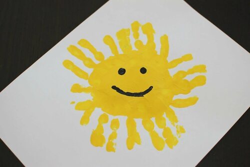 Надавите ладошкой на бумагу, оставляя следы от пальцев и линии от ладони. Это станет основой для солнышка.
