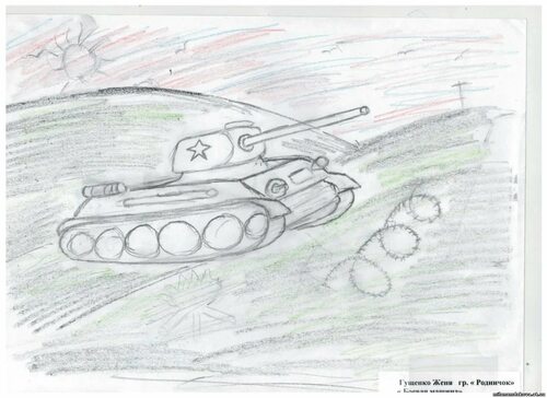 Танк - один из символов Великой Отечественной войны. Попросите ребенка нарисовать танк на фоне поля боя. Можно добавить дым от выстрелов и следы гусениц, чтобы сделать рисунок более реалистичным. Помогите ребенку выбрать правильные пропорции и детали танка, чтобы он выглядел правдоподобно.