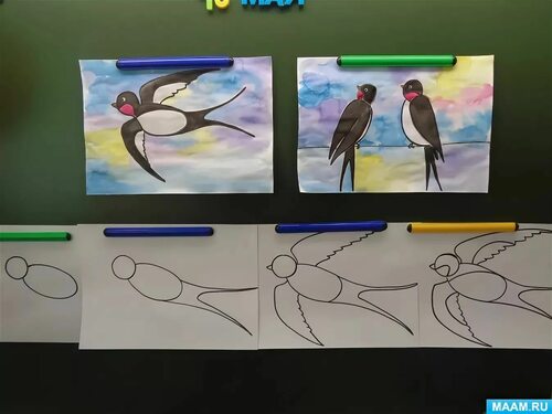 Следующий рисунок изображает ласточку - птицу, которая символизирует весну и свободу. Дети использовали светлые и нежные оттенки, чтобы передать легкость полета этой птицы. Рисунок полон движения и энергии, словно ласточка только что прилетела к нам издалека.