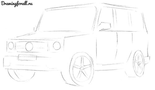 Начните с рисования основных линий и форм Гелендвагена. Начертите прямоугольник для кузова автомобиля и круглые колеса. Не беспокойтесь о деталях в этом шаге, просто сконцентрируйтесь на общих очертаниях.