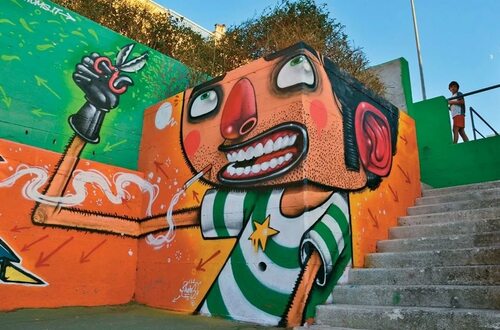 Этот граффити рисунок создает иллюзию огромного городского леса, заполнив стену зеленью и живописными растениями. Комбинация ярких и насыщенных цветов привлекает внимание и создает ощущение настоящей джунглевой атмосферы прямо посреди городской суеты.