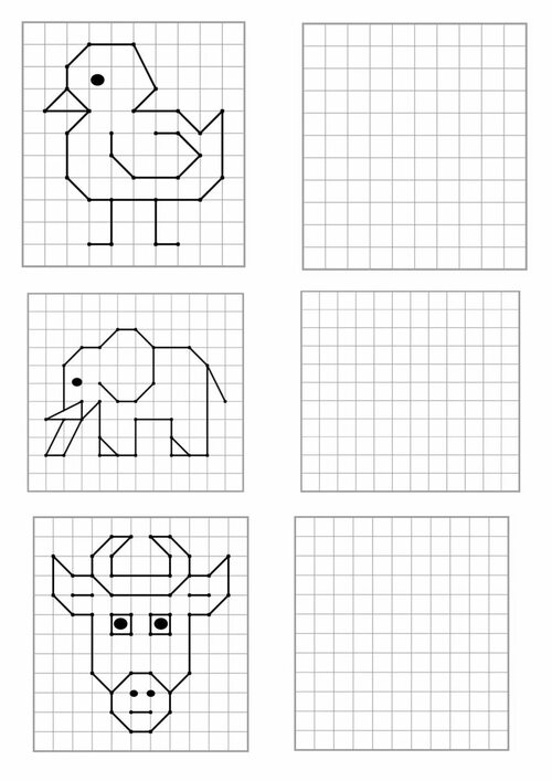 Рисуйте разные животные по клеточкам. Попробуйте нарисовать кошку, собаку или зайца. Ваш ребенок может добавить свои детали, чтобы сделать рисунок еще интереснее.