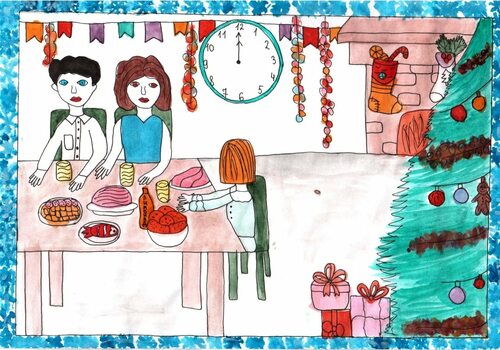 Нарисуйте момент, когда семья обменивается подарками. Используйте яркие цвета и показывайте радость на лицах родных и близких.
