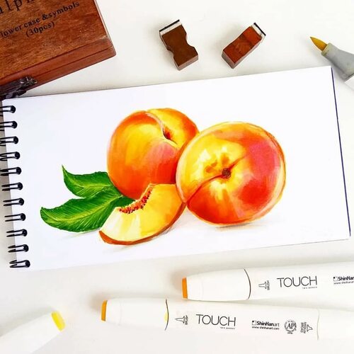 Персик - сочный и ароматный фрукт, который можно легко нарисовать маркерами. Возьмите оранжевый маркер и нарисуйте округлую форму персика. Добавьте небольшие темные пятна на поверхности персика, чтобы создать эффект текстуры. Затем добавьте зеленую веточку на верхушке персика. Ваш персик готов к наслаждению визуальным и вкусовым!