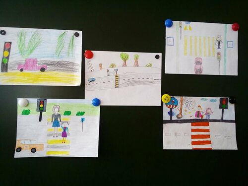 На рисунке также показаны пешеходы, которые переходят дорогу только по пешеходным переходам и при включенном зеленом сигнале светофора. Дети, рисующие этот рисунок, обратят особое внимание на необходимость соблюдения правил безопасности на дороге и будут знать, что нужно делать, чтобы избежать опасных ситуаций.