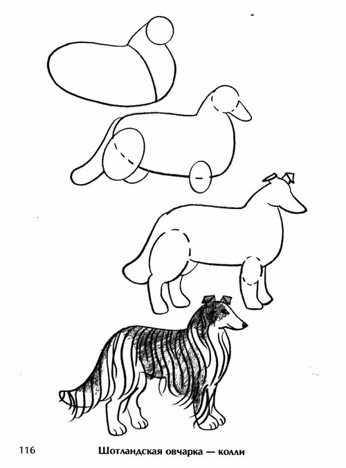 Посмотрите на фотографию колли собаки и решите, какую позу вы хотите изобразить на своем рисунке. Начертите общую композицию на бумаге, определяя положение головы, тела и лап.