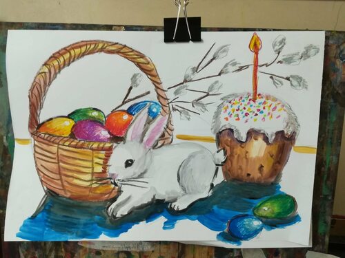 Поздравляю! Ваша пасхальная композиция в виде рисунка готова. Теперь вы можете использовать ее для украшения праздничного стола или подарить близким и друзьям. Не забудьте запечатлеть вашу творческую работу на фотографии, чтобы сохранить память о пасхальном празднике!