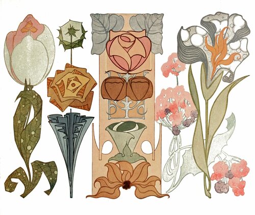 Этот рисунок в стиле арт нуво представляет собой изображение женской фигуры, окруженной цветами и растениями. Грациозные линии и плавные формы создают ощущение движения и легкости. Цветовая гамма включает нежные и пастельные оттенки, что придает рисунку нежность и романтичность.