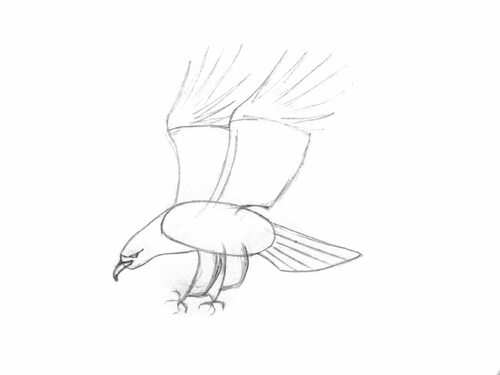 Продолжай добавлять детали, нарисовав туловище и хвост. Учти форму туловища и его покрытие перьями. Хвост коршуна должен быть изогнутым и грациозным.
